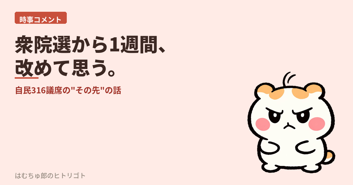衆院選の結果をざっくり振り返る 衆院選から1週間余りが経った。明日2月18日には第2次高市内閣が発足する。少し遅くなったけど、今回の選挙結果について書いておきたい。 2月8日に投開票が行われた衆院選は、自民党が316議席を獲得して歴史的な圧勝を収め... -