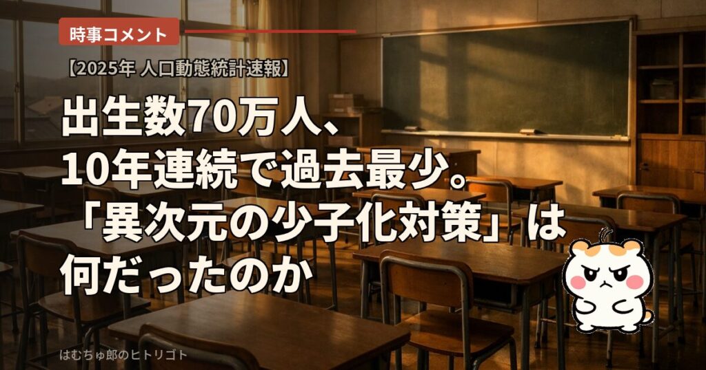 ニュースの概要 2月26日、厚生労働省が2025年の人口動態統計の速報値を公表した。 出生数は70万5,809人で、前年から約1万5,000人減り、10年連続で過去最少を更新した。なお、速報値には国内の外国人や国外の日本人、前年以前に届け出られた分も含まれるた... -