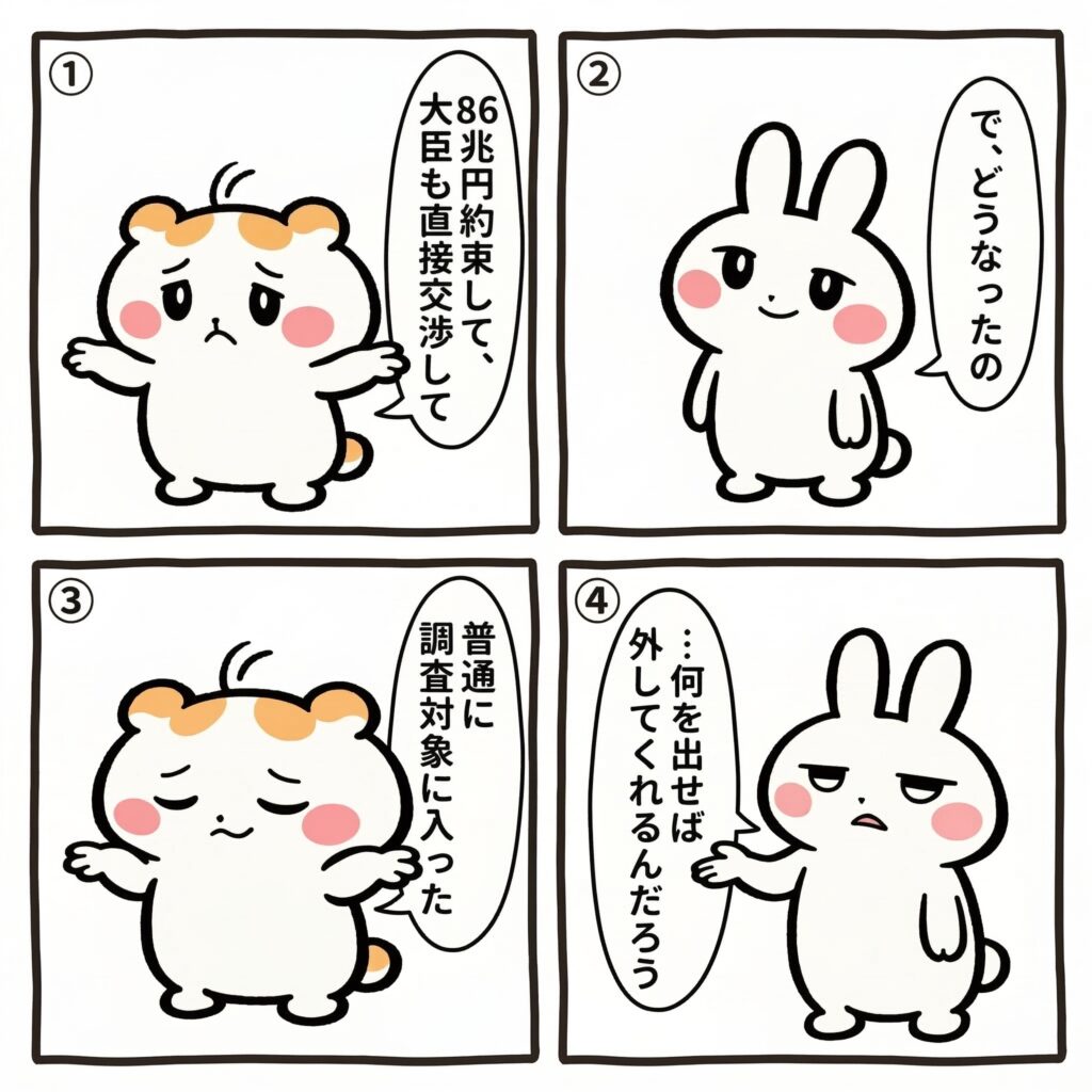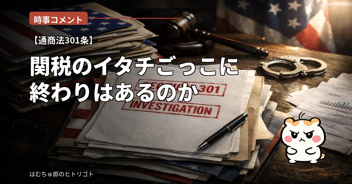 このブログでトランプ関税の話を書くのは、もう4回目になる。2月に最高裁に止められた時は「さすがにこれで終わるか」と思った。でもその直後に、別の法律(通商法122条)で10%の代替関税をかけ直した。さらに15%への引き上げまでにおわせている。86兆円規模の対米投融資を約束しても安心できない、という記事も書いた。そして今度は301条だ。