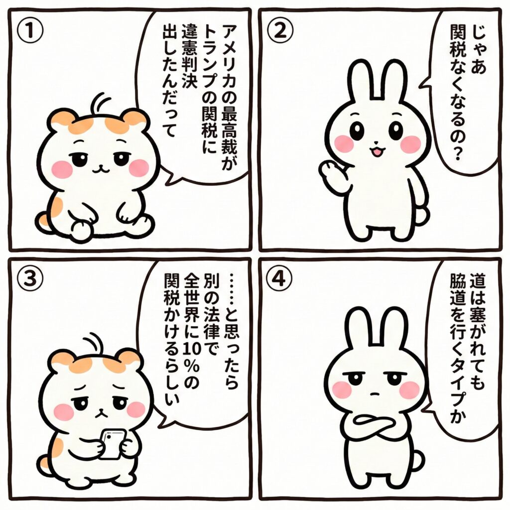 トランプ氏は判決の直後に「別の法律で関税をかける」と言い切った。要するに「ルートは変えるけど、やることは変えない」。違憲と言われても別の手段を探してくるあたり、関税はよほど引けない一線なんだろう。