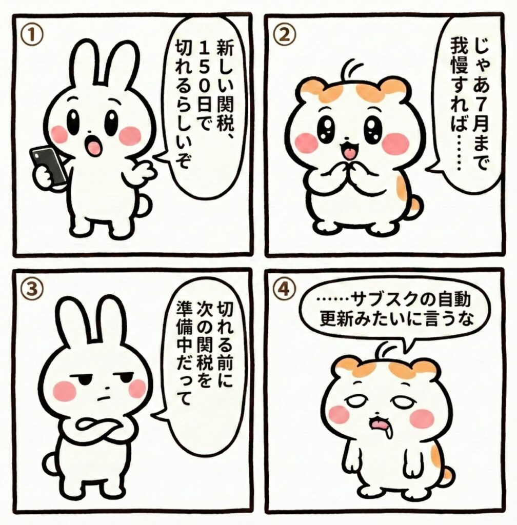 通商法122条による関税は最長150日で、延長するには議会の承認がいる。アメリカでは11月に中間選挙がある。関税で物価が上がれば有権者の反発は必至で、米シンクタンクの専門家も「議会が延長を認める可能性は低い」と見ている。つまり、7月下旬にはこの関税が自動的に失効するかもしれない。