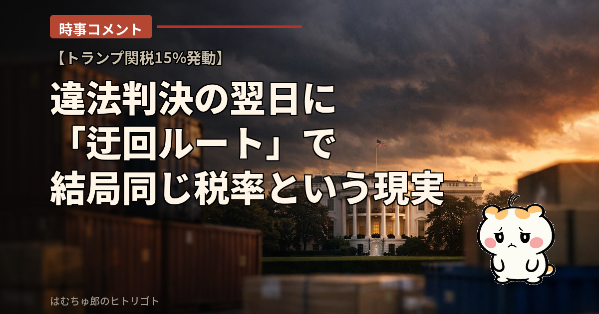前回の記事で「三権分立が機能した」と書いたけど、その感動が持ったのは半日もなかった。違法判決が出た当日中に別のルートで関税を復活させて、翌日にはSNSで「やっぱり15%」と言い出す。この切り替えの速さにはもう呆れるしかない。