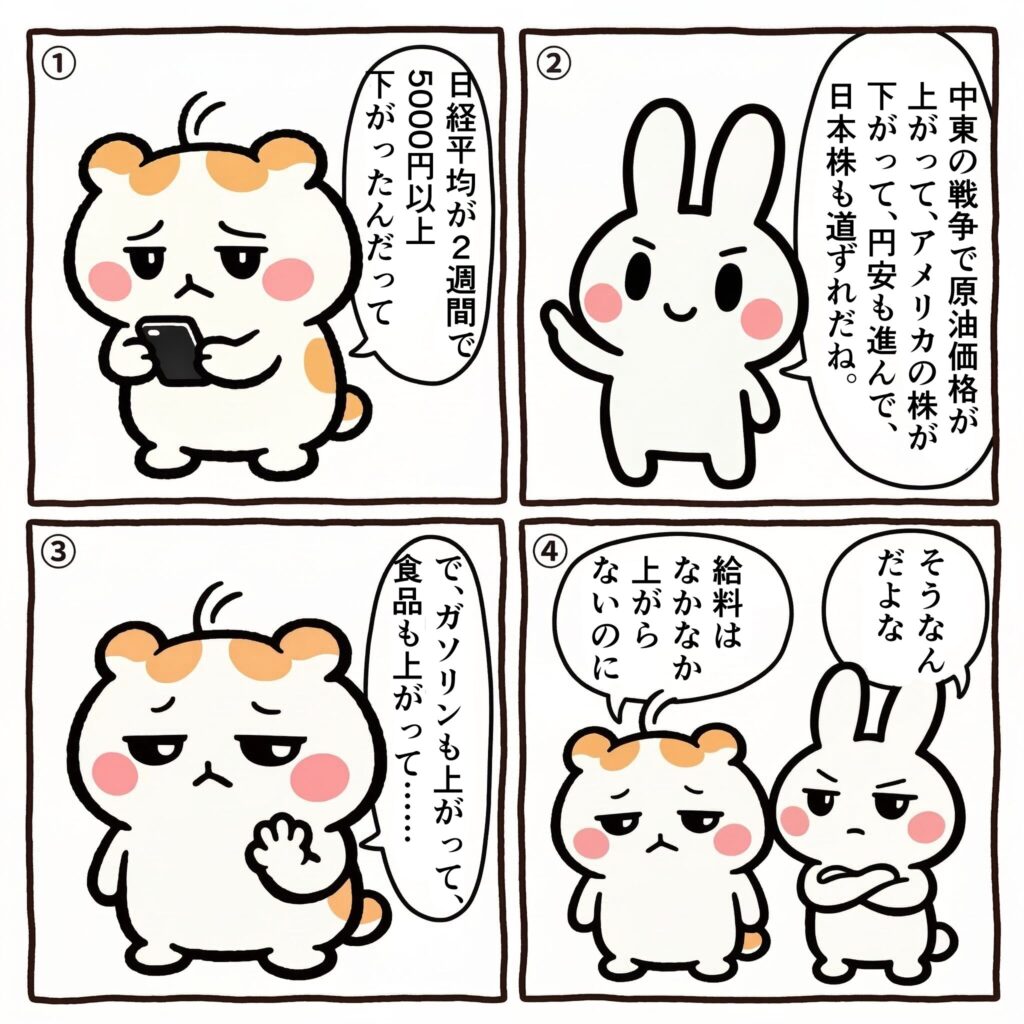 ここ数週間の流れを整理してみると、ドミノ倒しになっているのがよく分かる。中東で海峡の通航が制限され、原油が高騰する。前日の米株安や円安も重なって、日本株も売られる。遠い国の戦争が、回り回って僕らの財布を殴ってくる。