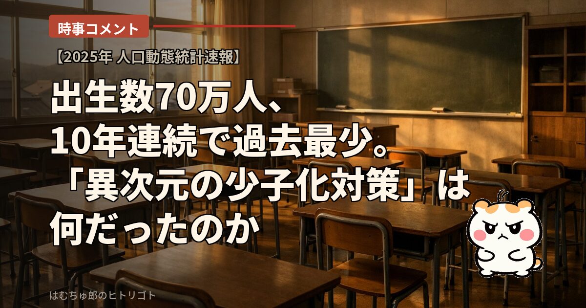 出生数70万人、自然減90万人。このまま現役世代の手取りが減り続けるなら、70万人という数字すら数年後には「あの頃はまだマシだった」と振り返ることになるかもしれない。