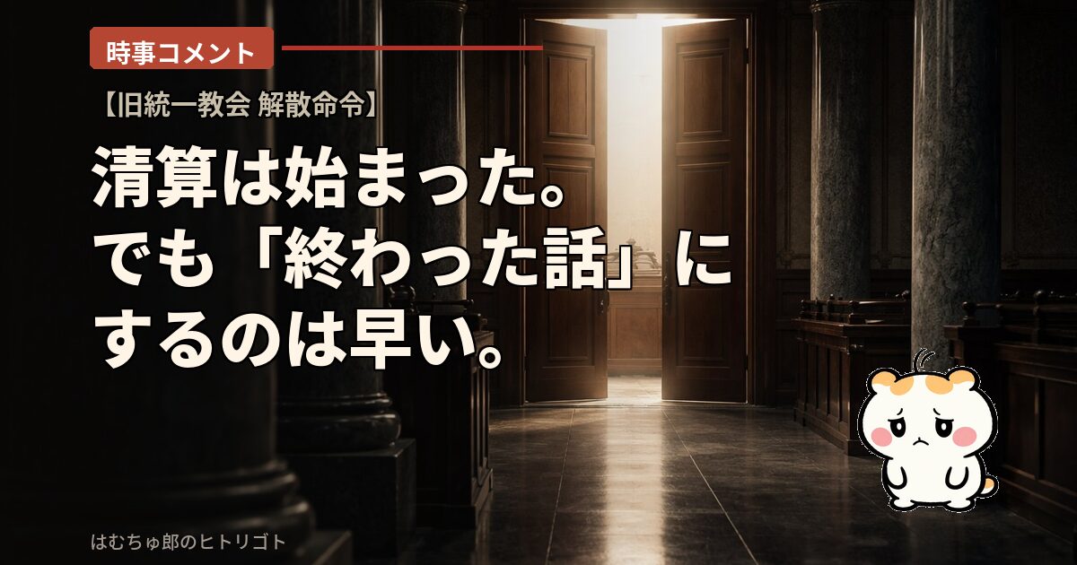 さらにTBSなどは、教団が早期退職を募り、正職員(約1,200人)のうち約340人が応じ(定年退職等と合わせ計約440人が退職予定)、数十億円規模の退職金を支払う見通しだと報じている。教団関係者は「財産を逃がす目的ではない」と否定しているが、このタイミングで数十億円も出したら、どう見ても「没収される前に分け合おう」という駆け込みに見える。資産の動きは今後も注視していく必要がある。