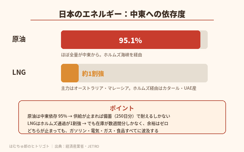 ただ、今回ばかりはちょっと話が違う。日本の原油輸入の中東依存度は、2025年の年間実績で93.5%(JETRO)。2026年1月の速報値では**95.1%**まで上がっている(経済産業省)。その大半が、イランの目と鼻の先にあるホルムズ海峡を通って運ばれてくる。