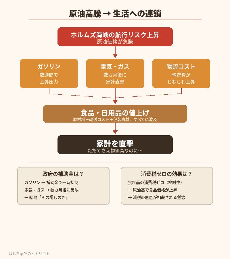 これは原油だけの話じゃない。LNG(液化天然ガス)の長期契約価格は原油に連動する仕組みが多いから、原油が上がればガス代も電気代も引きずられて上がる。ガソリンは当面政府の補助金で店頭価格が抑えられるにせよ、数週間で上昇圧力がかかる。電気・ガスは燃料費調整制度のタイムラグがあるので、家計への本格的な影響は数カ月後にやってくる。