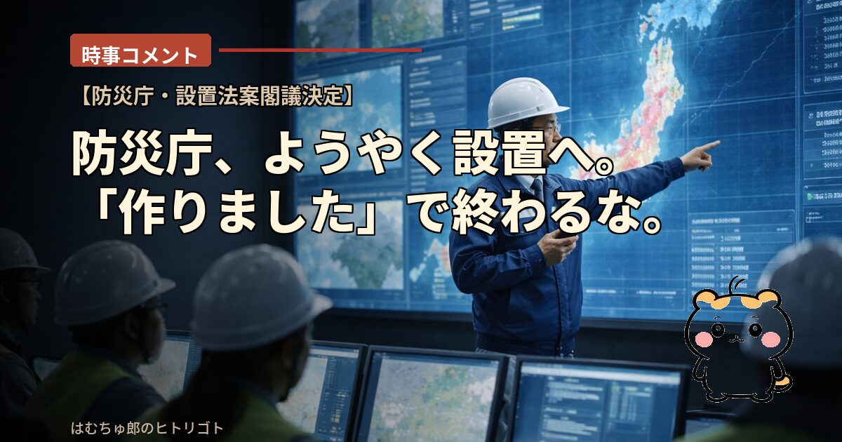 防災庁、ようやく設置へ。必要だと思う。でも「作りました」で終わらないでくれ