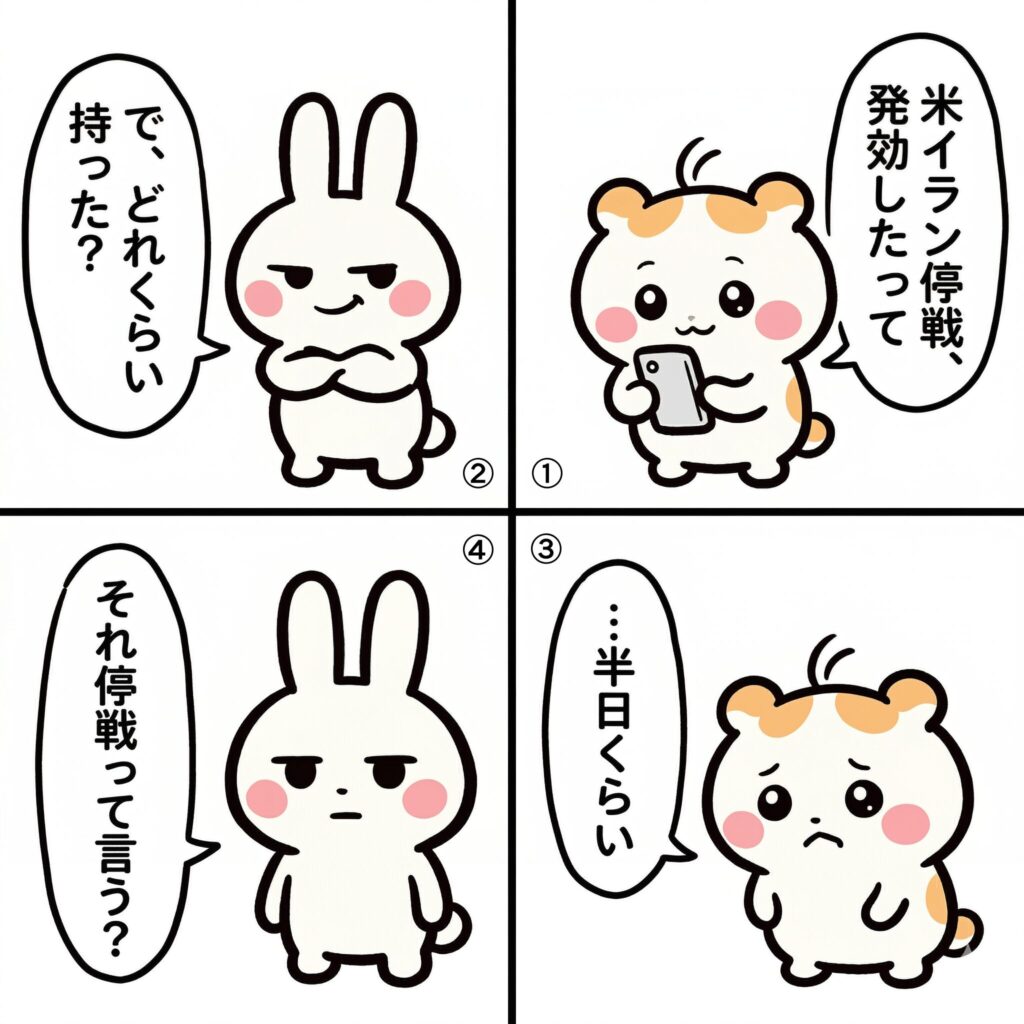 4月8日、米国とイランがパキスタンの仲介で2週間の停戦に合意し、発効した。ホルムズ海峡の条件付きの通航再開が停戦条件に含まれていた。