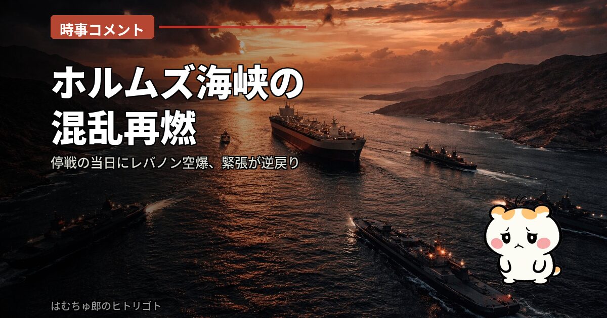 停戦が発効した日に、イスラエルがレバノンを空爆する。イランは「話が違う」と怒る。それで海峡の通航は結局ほとんど改善しないまま。落ち着く気配が見えたと思ったら、また一気に遠のいた感じだ。